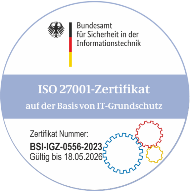 Das Zertifikat BSI-IGZ-0556-2023 umfasst unser Information Security Management System (ISMS), die Infrastruktur der beiden Rechenzentren sowie die Netz- und Diensteinfrastruktur für den technischen Verfahrensbetrieb von Verwaltungsverfahren unserer Kund*innen.