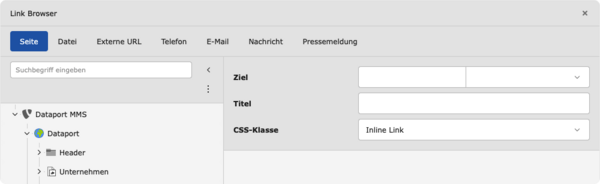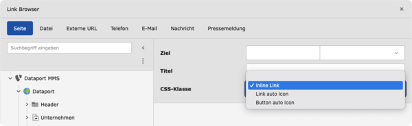 Wichtig! Wenn Sie News oder Pressemitteilungen von Dataport im RTE verlinken möchten, nutzen Sie die Verlinkungsart „Nachricht“ bzw. „Pressemeldung“ (s.u.). Setzen Sie keine externe Verlinkung!