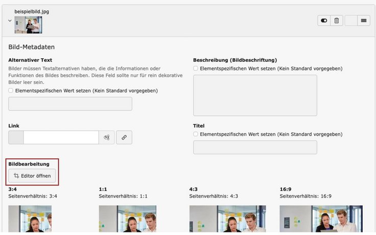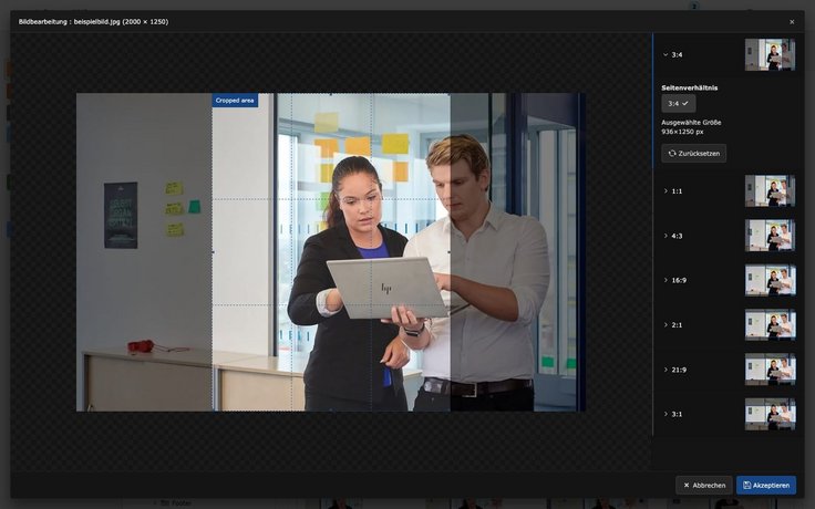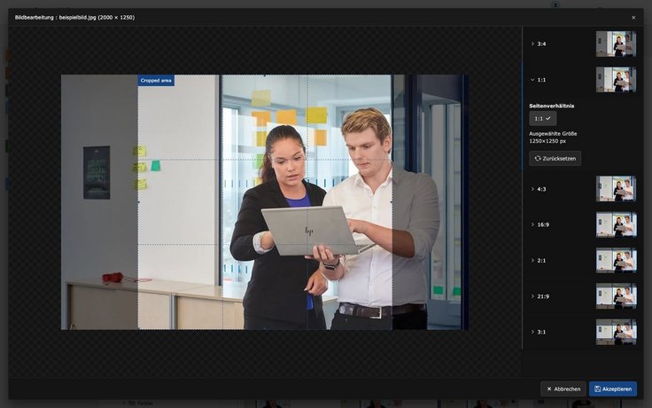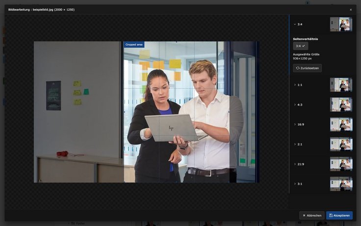 Klicken Sie in den Bild-Metadaten den Button „Editor öffnen“ unter Bildbearbeitung. Es öffnet sich ein Dialog, in dem Sie die Bildausschnitte für verschiedene Seitenverhältnisse festlegen können. Diese werden z.B. für die unterschiedlichen Teaser- und Hero-Formate verwendet, für die Desktop- und Mobile-Ansichten oder für die Ausgabe im Inhalts-Element.