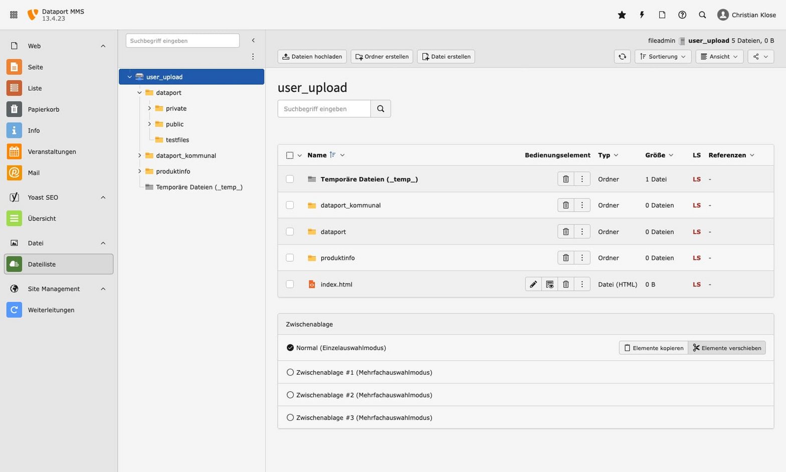 Laden Sie nie Dateien direkt in den user_upload, sondern immer in einen der entsprechenden Unterordner. Existiert noch kein Ordner? Dann legen Sie ihn mit dem Button „Ordner erstellen“ über dem Inhaltsbereich an.
