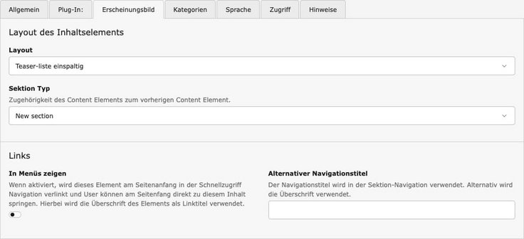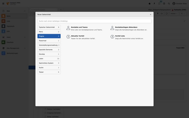Wählen Sie im Popup „Neuer Seiteninhalt“ den Reiter „Plugins“ an und dort das Element „Kontakte und Teams“.