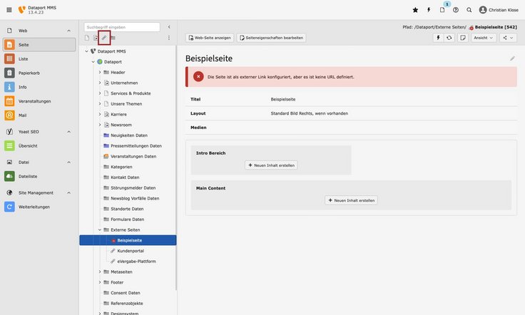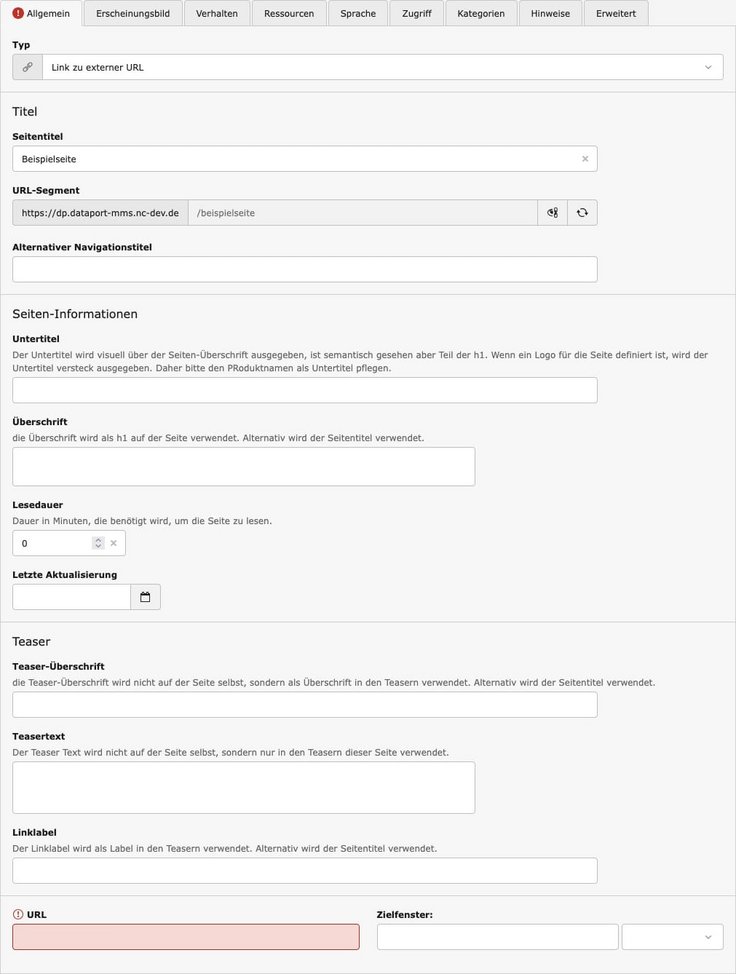 Auch externe Seiten können angeteasert werden. Dafür muss zunächst jedoch eine Seite angelegt werden, die ein Verweis auf eine externe URL ist. Führen Sie folgende Schritte durch:
