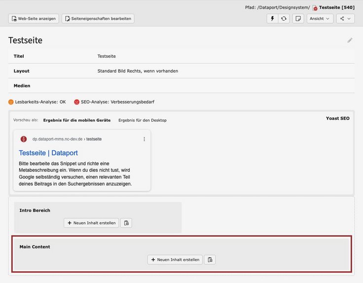 Klicken Sie im Inhaltsbereich an der Stelle, an der die Seite/n angeteasert werden soll/en auf den Button „Neuen Inhalt erstellen“.
