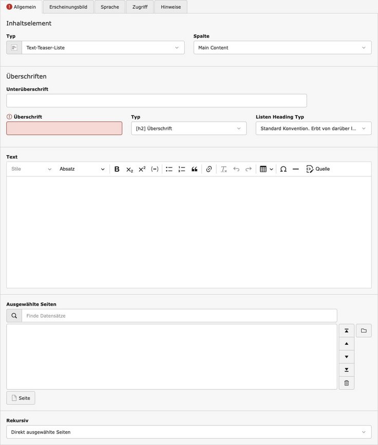 Seiten anlegenWenn Sie auf andere Seiten verweisen wollen, verwenden Sie Teaser-Elemente. Die Teaser-Elemente haben zu einfachen Text-Verlinkungen im RTE den Vorteil, dass sie automatisch ausgeblendet werden, wenn die verlinkte Seite ausgeblendet wird.