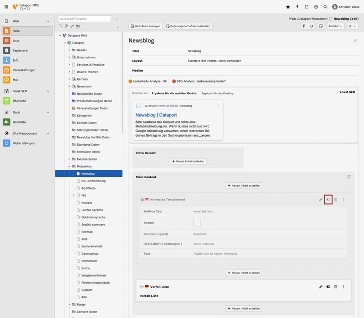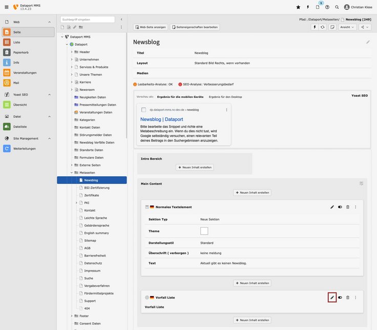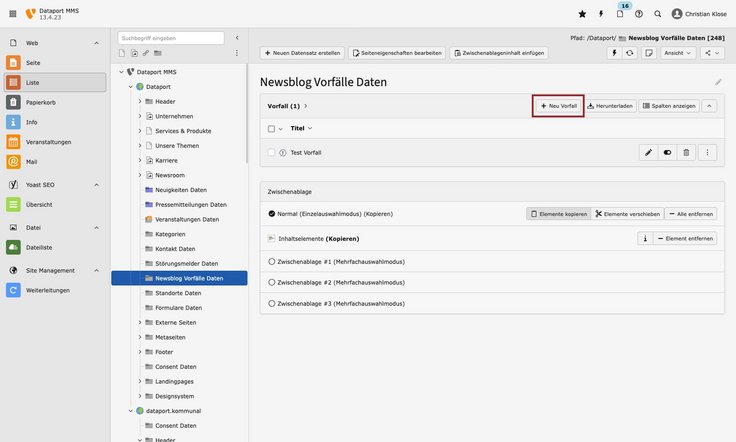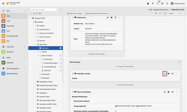 Aktueller VorfallVorfälle werden als Datensätze gepflegt und auf der Seite „Newsblog“ im Ordner „Metaseiten“ ausgegeben. Der Vorfall muss auf der Seite „Übersicht“ unter dem Navigationspunkt „Newsroom“ im Inhaltselement „Aktueller Vorfall“ ausgewählt werden.