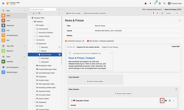 Bearbeiten Sie auf gleiche Weise das Plugin auf der Seite „News & Presse“ unter „Newsroom“.