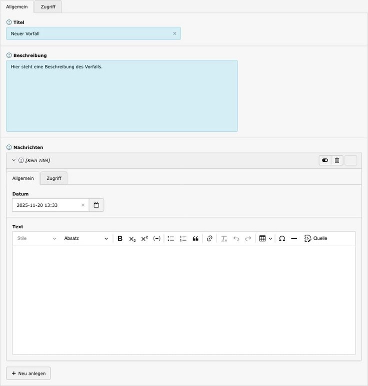 Sollte noch kein entsprechender Vorfall angelegt worden sein, führen Sie folgende Schritte durch. Wenn dort bereits ein Vorfall angelegt wurde, können Sie den Vorfall direkt auf der News-Übersicht verlinken.