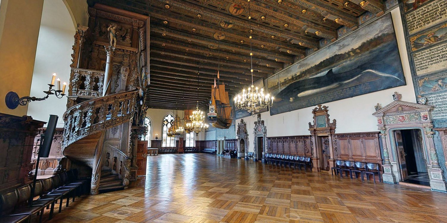 Dataport integrierte in den 360-Grad-Rundgang so genannte Points of Interest, wie es in Navigationssystemen oder Routenplanern üblich ist. Mit einem Mausklick lassen sich auf diese Weise Informationen zu kulturell oder historisch interessanten Orten und Objekten aufrufen. So können Interessierte unter anderem die Obere Halle, die Güldenkammer (siehe Screenshot) und weitere Kunstschätze des mehr als 600 Jahre alten Rathauses detailliert kennenlernen.