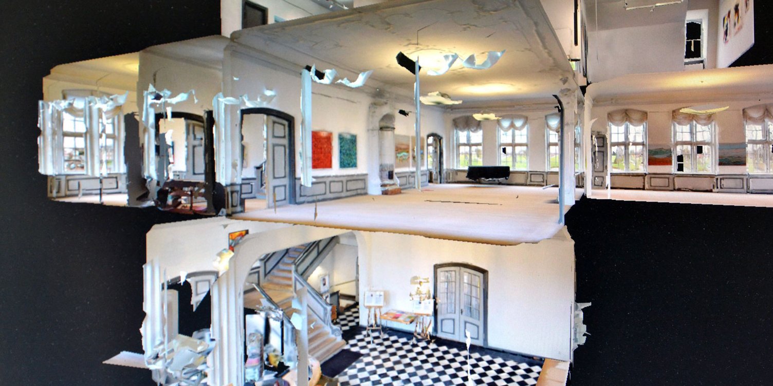 Mit einem 3D-Scan und Panoramafotos hat Dataport Räume und Ausstellungsgegenstände der Drostei in den vergangenen Tagen erfasst und visuell für einen 360-Grad-Rundgang aufbereitet. Zu sehen ist die 10. Auflage der Ausstellung „früh werk“, bei der Oberstufenschülerinnen und -schüler aus ganz Schleswig-Holstein Exponate aus den Bereichen Malerei, Zeichnung, Druck, Fotografie, Objekt, Film, Illustration und Mode präsentieren. Am Bildschirm können Besucher Räume einzeln durchlaufen oder die gesamte Drostei per Dollhouse View (Puppenhaus-Ansicht) anschauen.