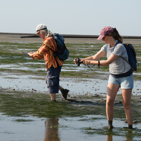 Wir laufen an jedem Aufnahmeort einen zehn mal zehn Meter großen Bereich ab und machen dort bis zu 20 Bilder vom Wattboden. Dabei passen wir auf, dass keine Fußstapfen oder Füße zu sehen sind oder Wasserreflexionen oder aufgewirbelte Sedimente die Auswertung des Bildes beeinflussen. In der Praxis hat sich herausgestellt, dass Smartphone-Fotos wegen der automatischen Bildoptimierung für unsere Zwecke nicht ausreichen. Deshalb nutzen wir eine gute Systemkamera.