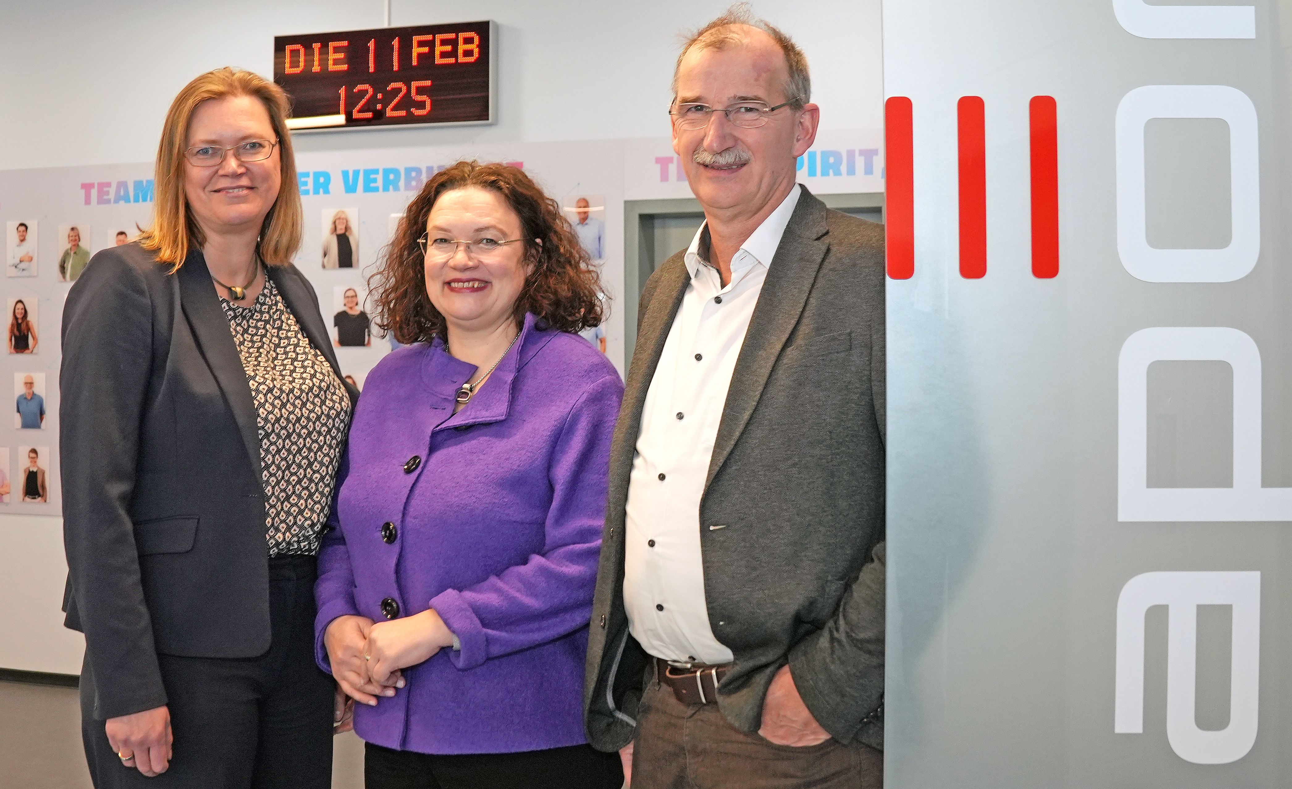 Die Vorstandsvorsitzende der Bundesagentur für Arbeit, Andrea Nahles, hat am 11. Februar 2025 Dataport AöR in Altenholz besucht, um sich über den Stand der digitalen Transformation in der öffentlichen Verwaltung zu informieren. Begleitet wurde sie von Dirk Schrödter, Minister für Digitalisierung und Medienpolitik des Landes Schleswig-Holstein und Markus Biercher, Vorsitzender der Geschäftsführung der Regionaldirektion Nord der Bundesagentur für Arbeit.