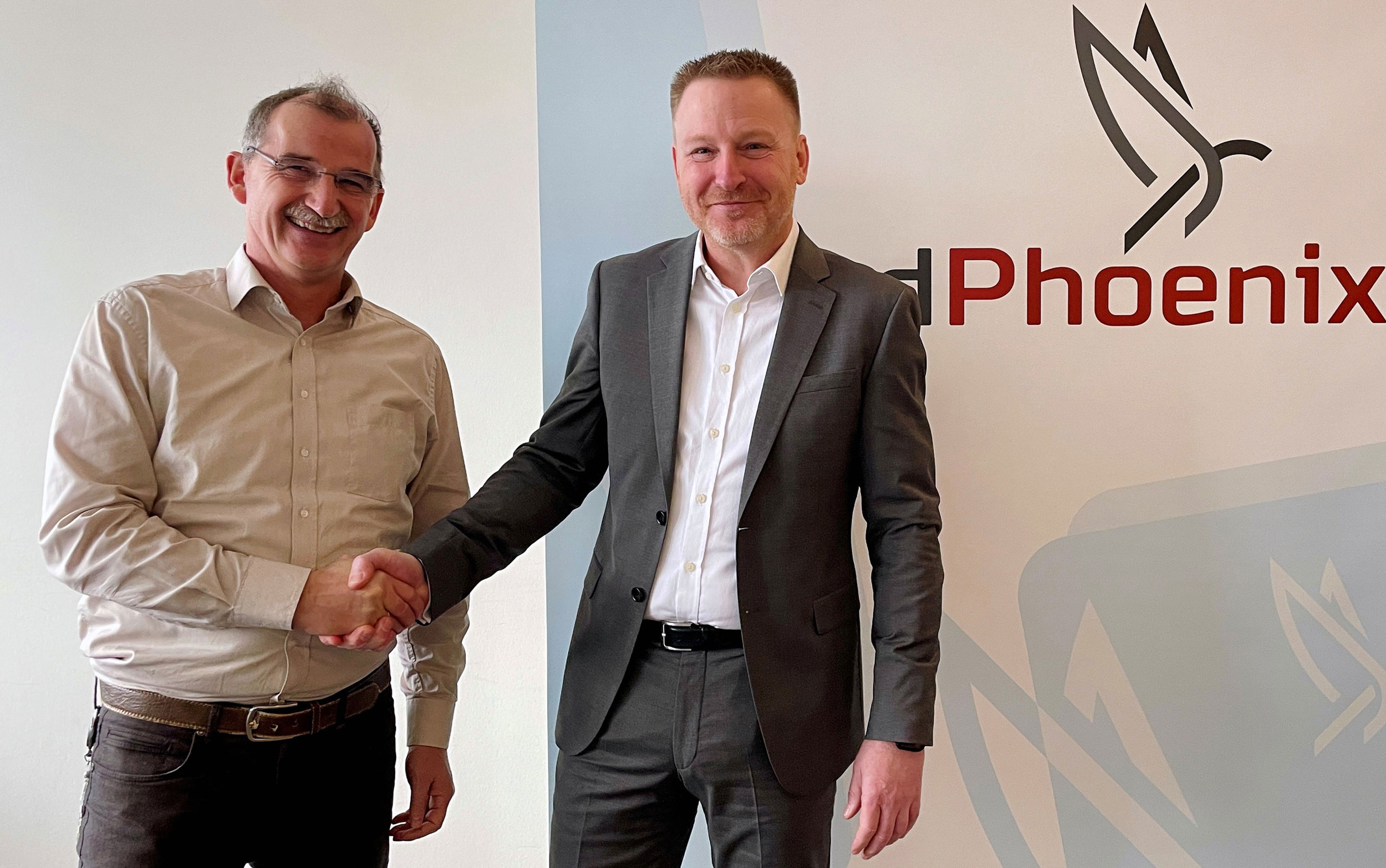 Dr. Johann Bizer, Vorstandsvorsitzender von Dataport (links im Bild) und Thomas Garbe, Geschäftsführer SoftwareOne Deutschland, besiegeln die Vertriebspartnerschaft zur dPhoenixSuite.